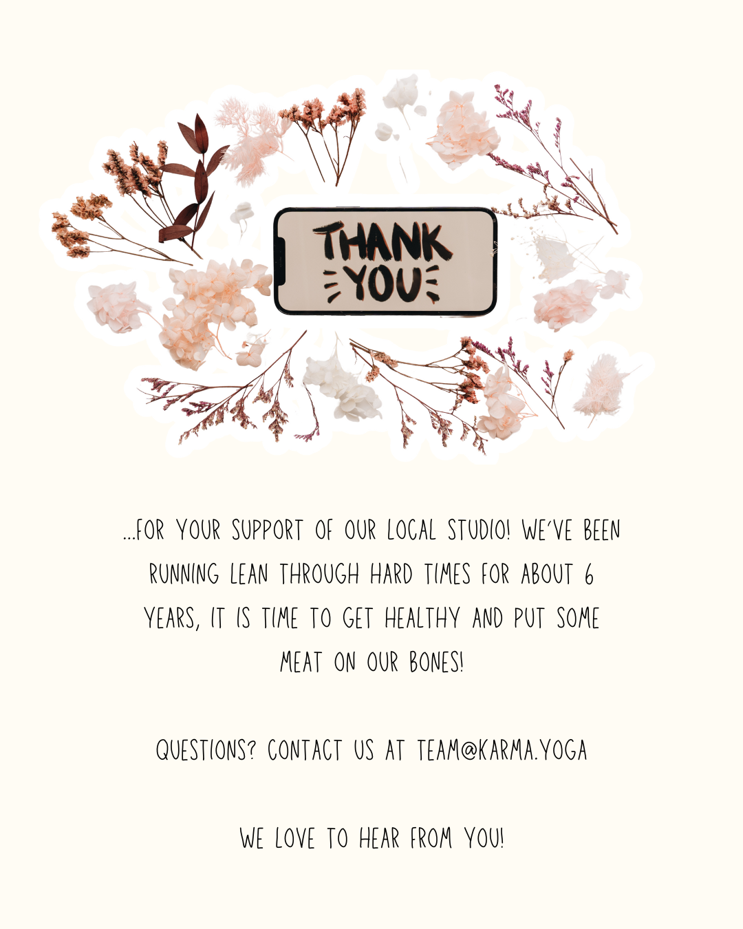 With this 40-Pack you can take studio or virtual classes, and apply credits toward any workshop. As a courtesy, if you are unable to use this pack towards classes or workshops, we can apply the remaining value toward courses, trainings or retreats. Please email team@karma.yoga for any assistance 🙏